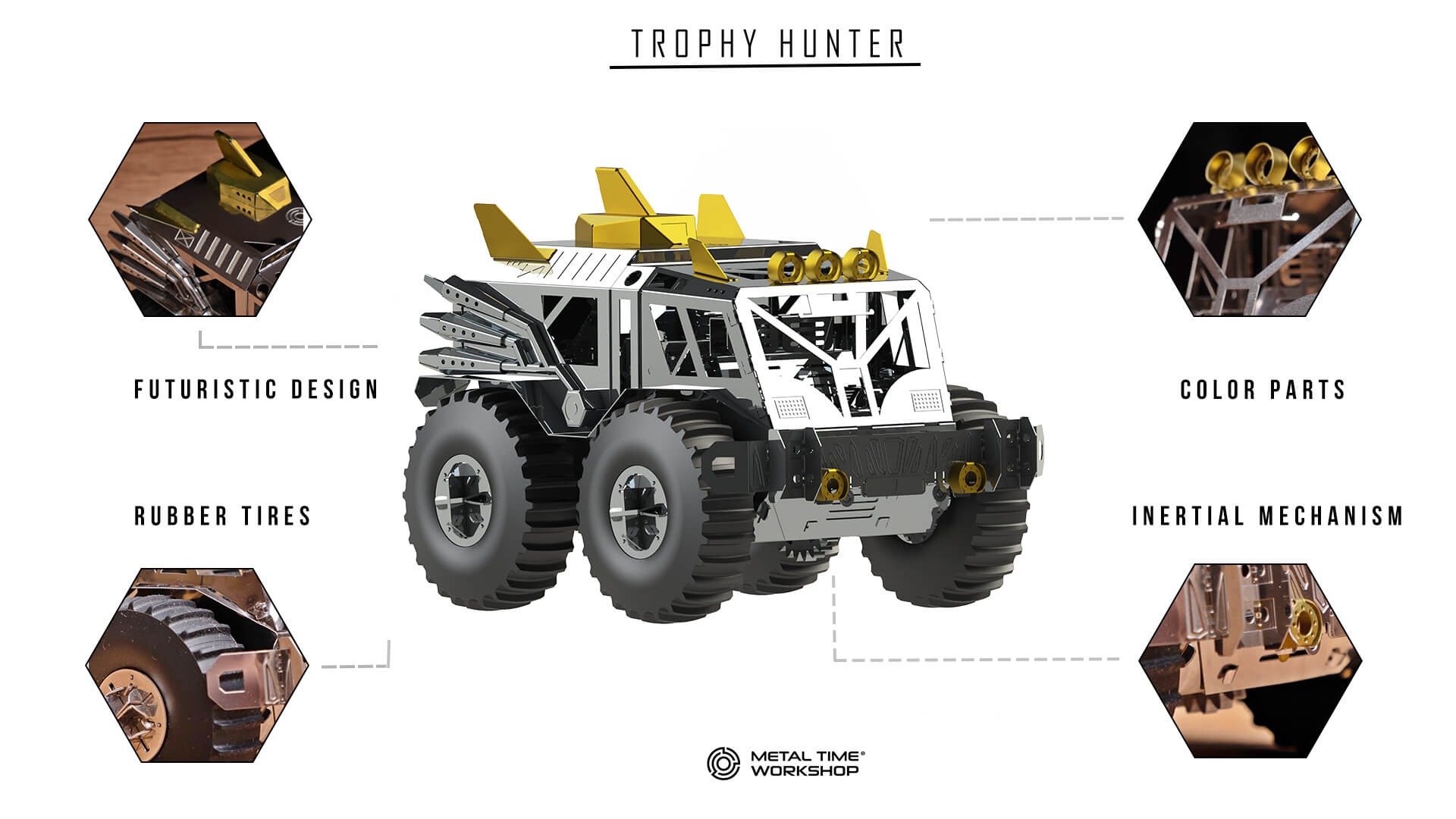 Το "Trophy Hunter" μπορεί να είναι μέρος της συλλογής σας "Metal Time" αφιερωμένη σε οχήματα, ακραία αυτοκίνητα, sci-fi ή βιντεοπαιχνίδια. Μπορείτε να αναπληρώσετε τον στόλο μοντέλων αυτοκινήτων σας με αυτό και να το χρησιμοποιήσετε σε παιχνίδια, δημιουργώντας διατάξεις και εγκαταστάσεις.
