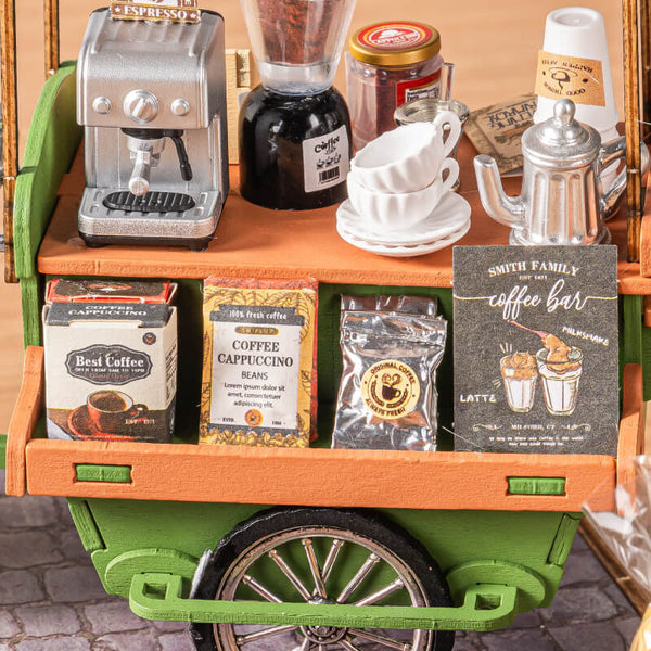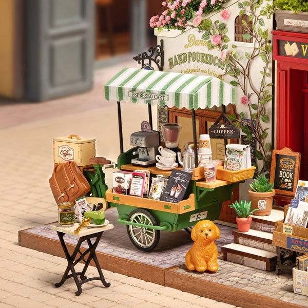Η δελεαστική μυρωδιά του καφέ απλώνεται στον αέρα καθώς περνάει το Rolife Aromatic Coffee Cart. Αφεθείτε στον πειρασμό και φτιάξτε αυτό το αξιολάτρευτο μικροσκοπικό μοντέλο που μπορείτε να συνδυάσετε με άλλα μικροσκοπικά σπίτια Rolife.