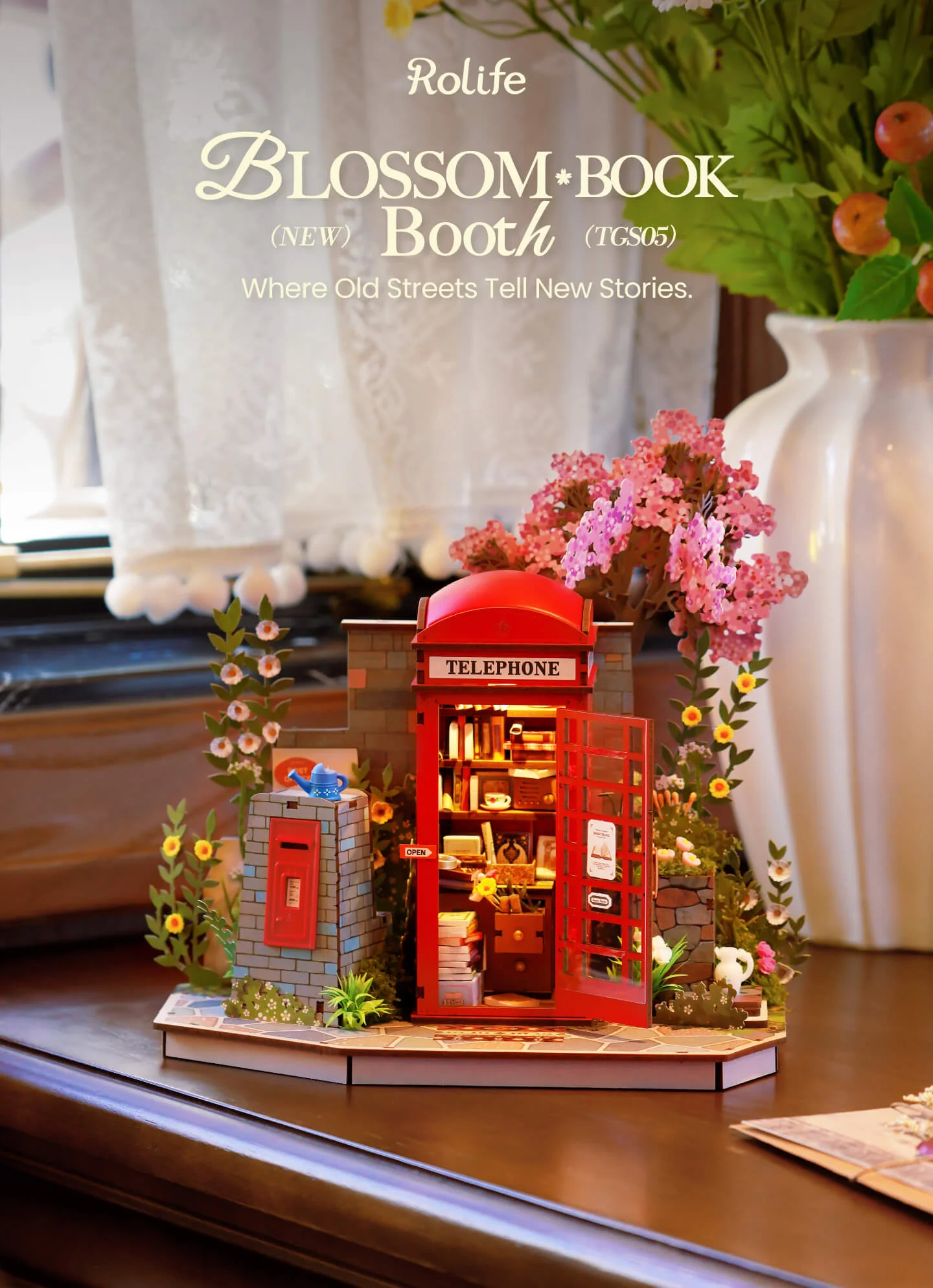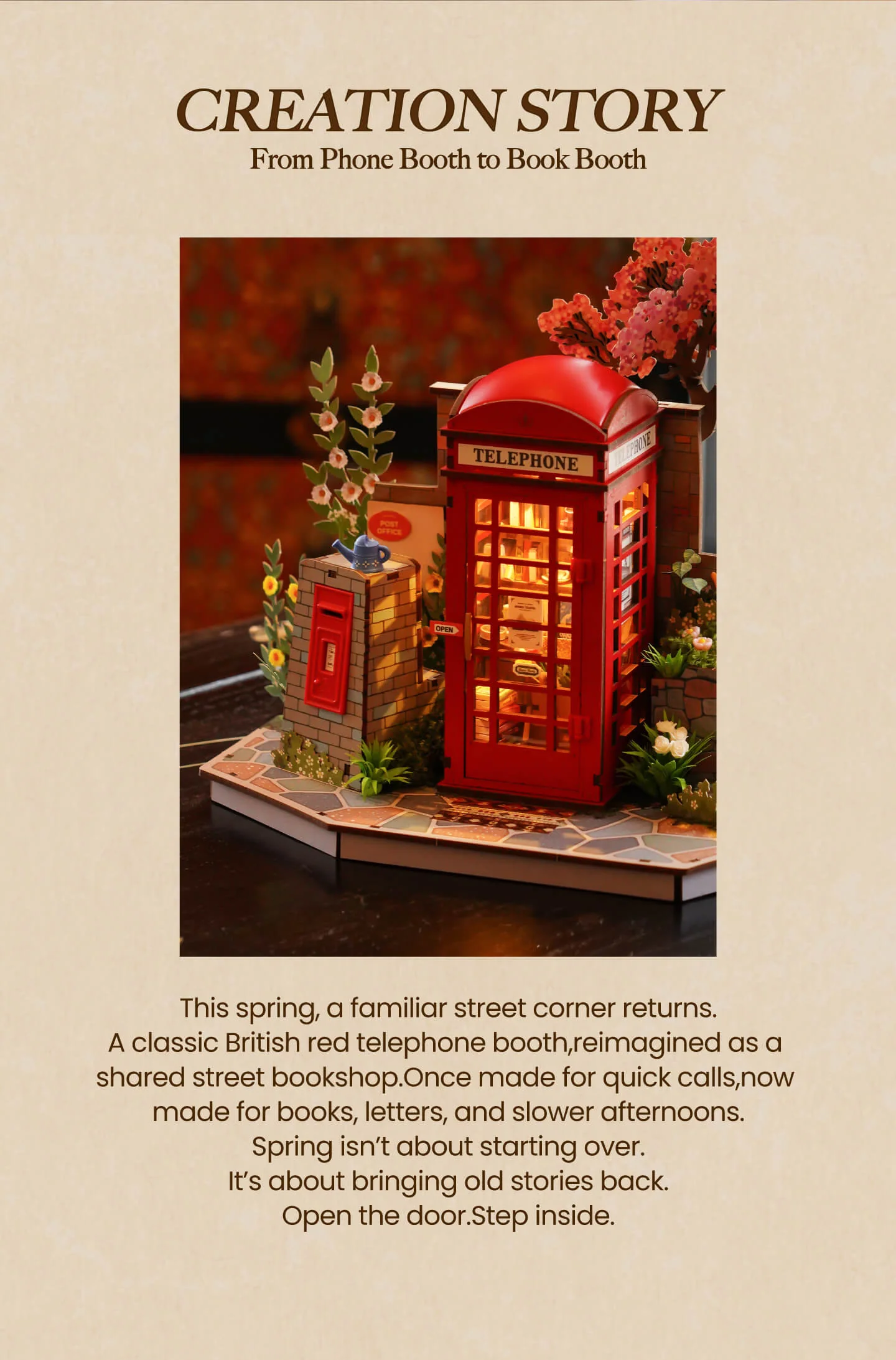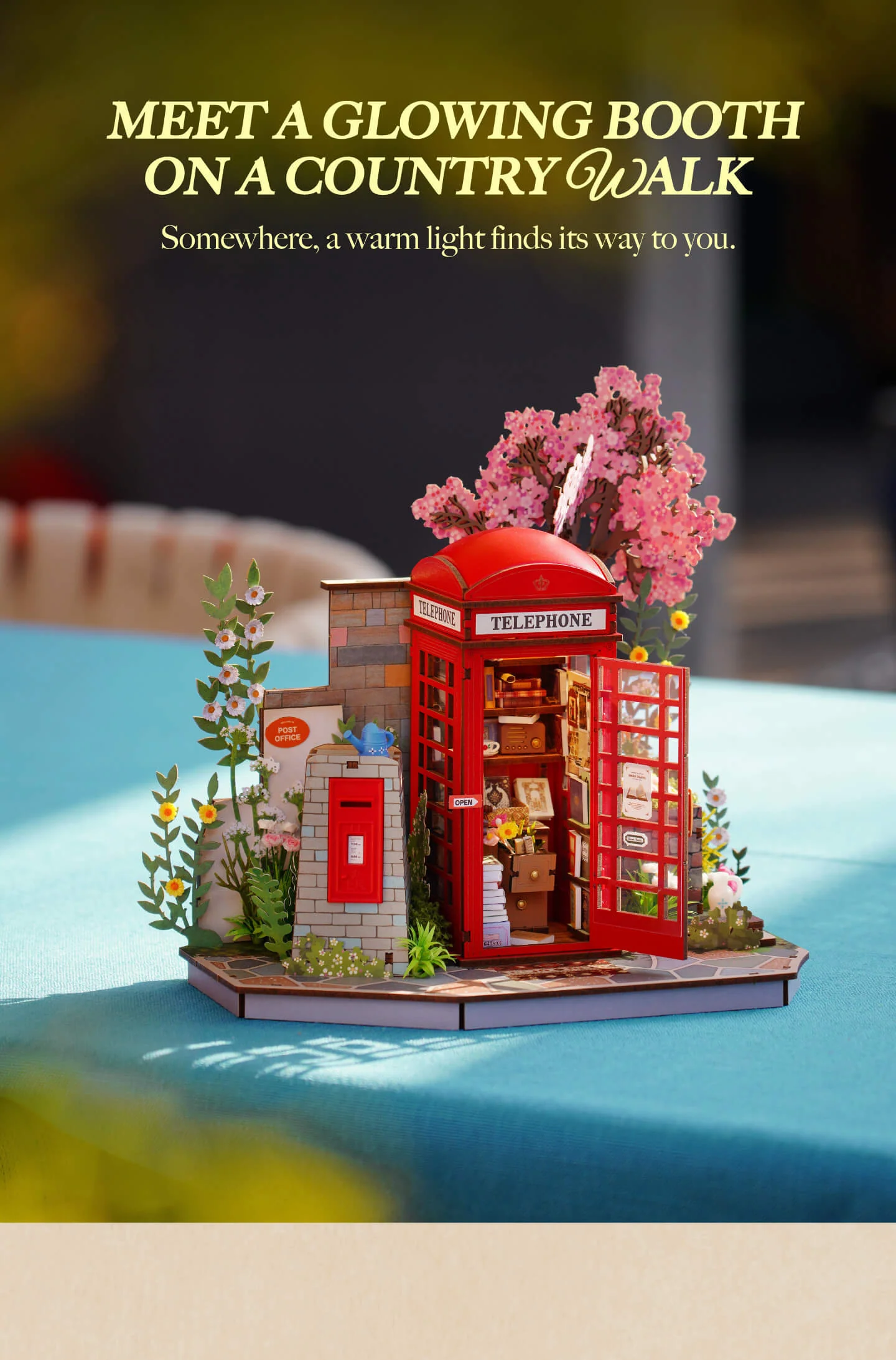 Ένα ξύλινο τρισδιάστατο παζλ χωρίς κόλλα με ενσωματωμένο ζεστό φωτισμό. Μέσα από τη λεπτή συναρμολόγηση λουλουδιών και βιβλίων, αναπαράγει τη γοητεία ενός εμβληματικού τηλεφωνικού θαλάμου γωνίας, ακριβώς πάνω στο γραφείο σας.