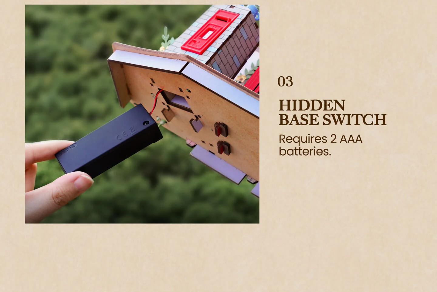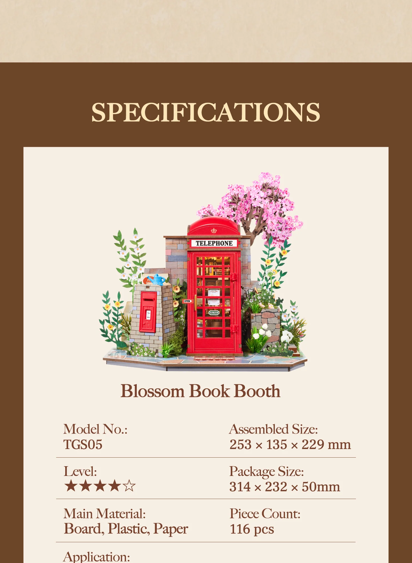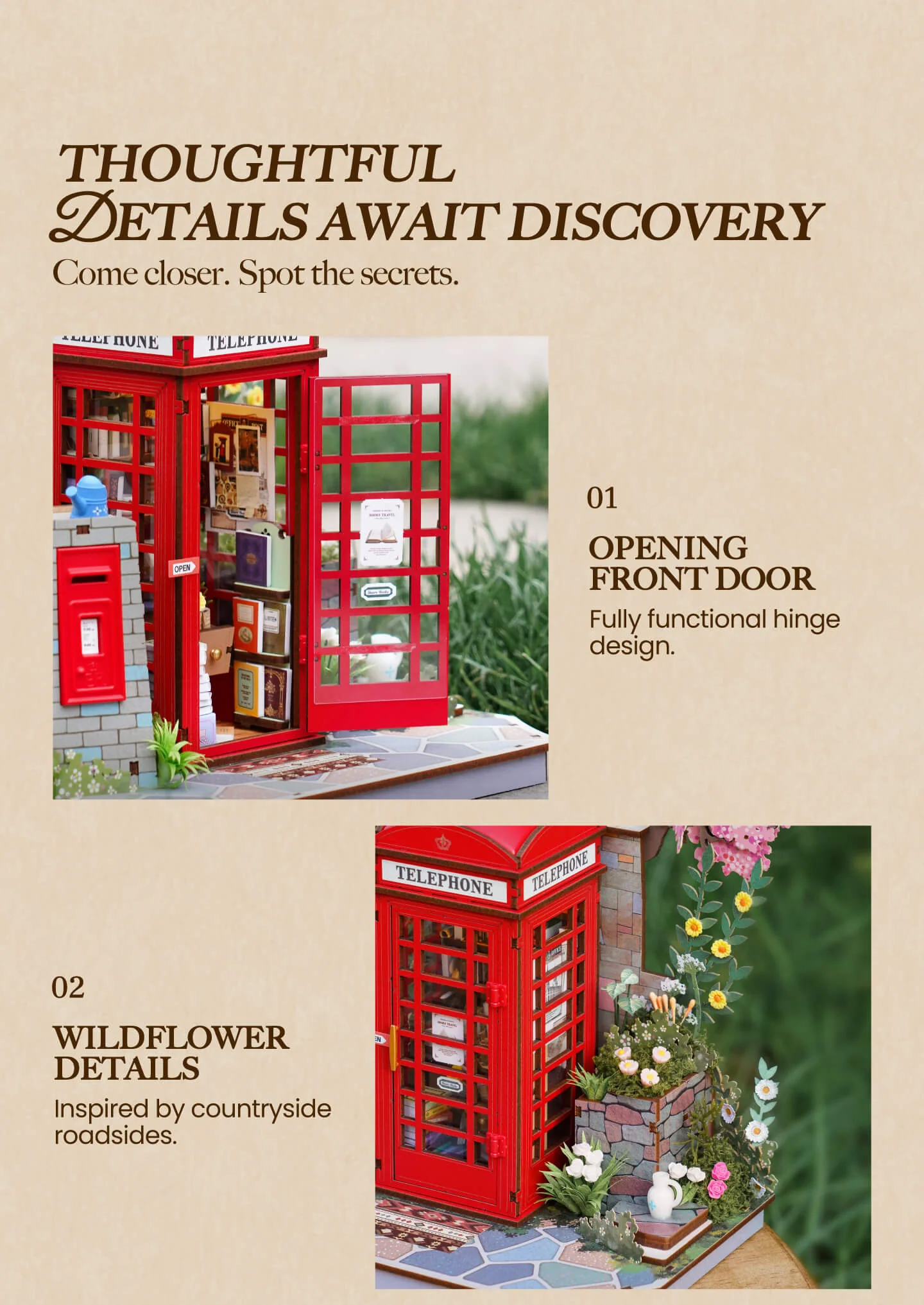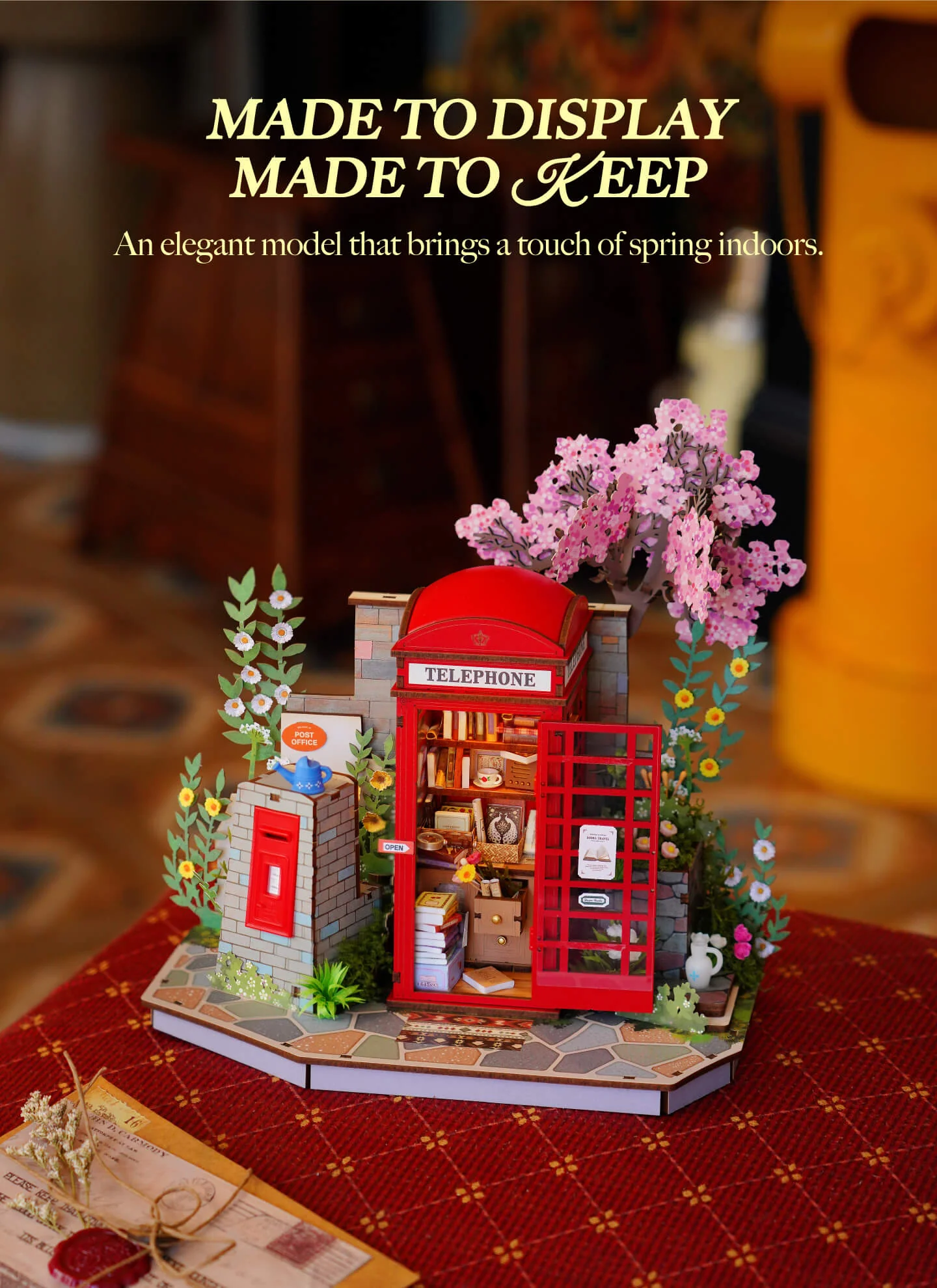 Ένα ξύλινο τρισδιάστατο παζλ χωρίς κόλλα με ενσωματωμένο ζεστό φωτισμό. Μέσα από τη λεπτή συναρμολόγηση λουλουδιών και βιβλίων, αναπαράγει τη γοητεία ενός εμβληματικού τηλεφωνικού θαλάμου γωνίας, ακριβώς πάνω στο γραφείο σας.