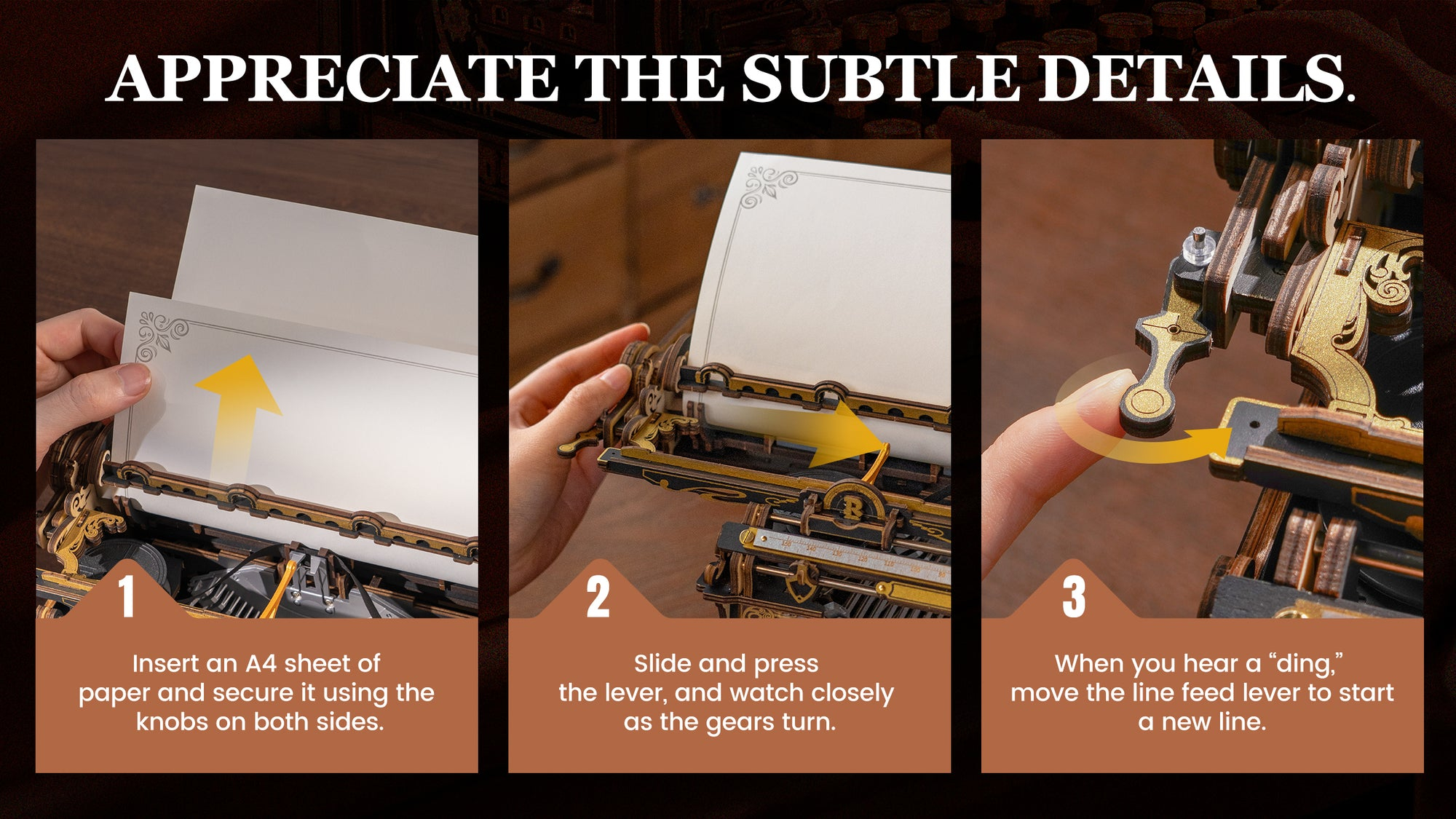 Με κάθε πάτημα, τα πλήκτρα, τα γρανάζια και οι ράβδοι πληκτρολόγησης κινούνται συγχρονισμένα, αναπαράγοντας την απτική γοητεία μιας κλασικής γραφομηχανής, ενώ αφήνουν πραγματικά αποτυπώματα στο χαρτί.